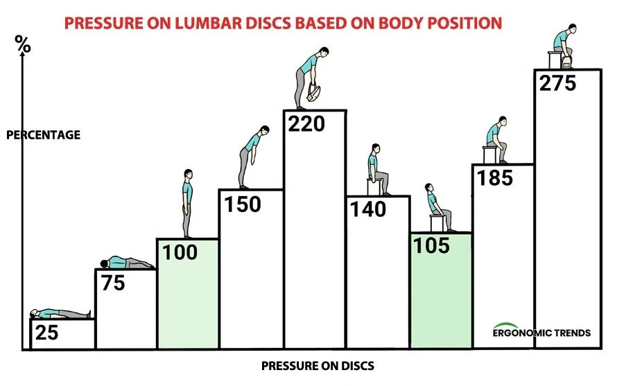 The amount of pressure we put on our spine is greatly affected by our position. Have you ever noticed how your lower back stiffens after a long flight or car ride? 🖐️ If I had to choose, I much prefer to stand than to sit, and this chart breaks it down beautifully how the low back is loaded differently in these positions.
